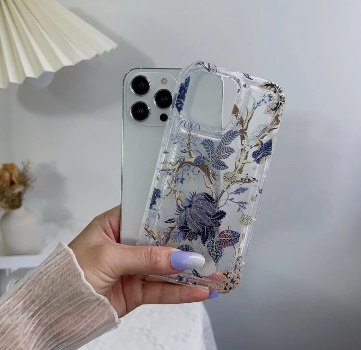 花柄 フラワー アート風 ブルー ゴールド クリア iPhoneケース スマホケース