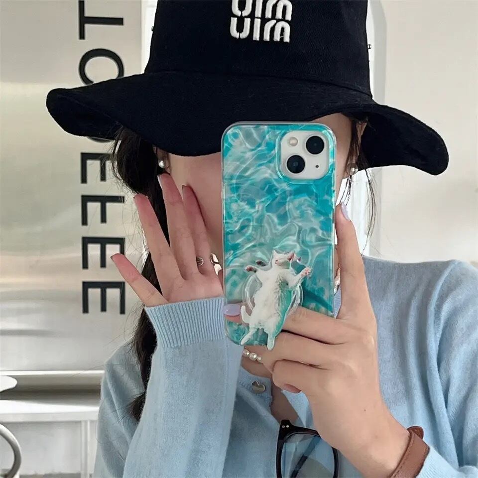 iPhoneケース スマホケース 猫 ネコ 海 プール スマホグリップ付き