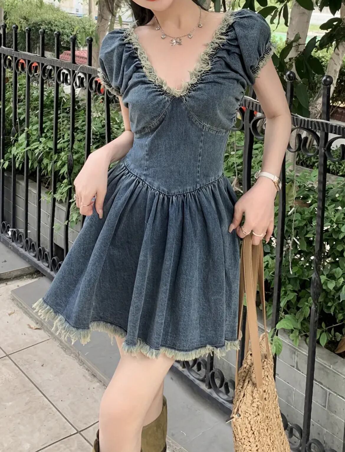 デニムワンピース レディース ワンピース 半袖 Vネック パフスリーブ ミニワンピース Aラインワンピース 細見え 脚長効果 韓国女子 春 夏 デート お出掛け 海 旅行 | Syanamii - 3点購入+フリーギフト1点