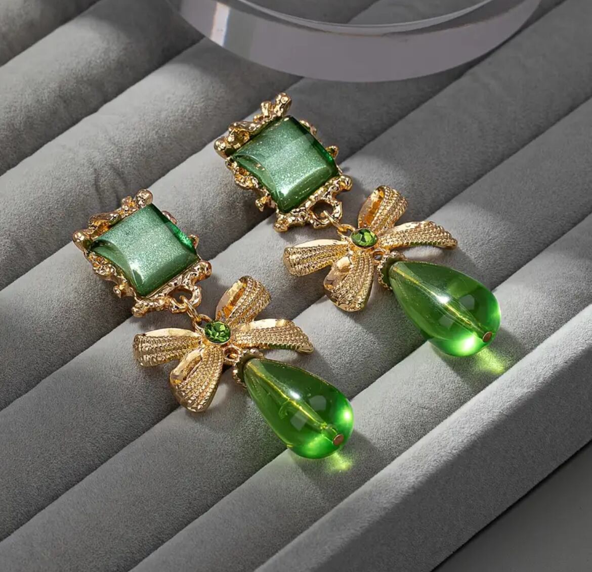 イヤリング 両耳用 ヴィンテージ アクセサリー ゴールド グリーン リボン 雫 揺れるイヤリング 上品 大人